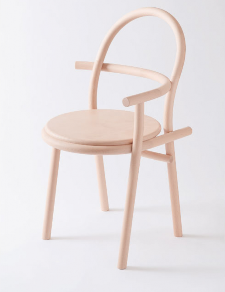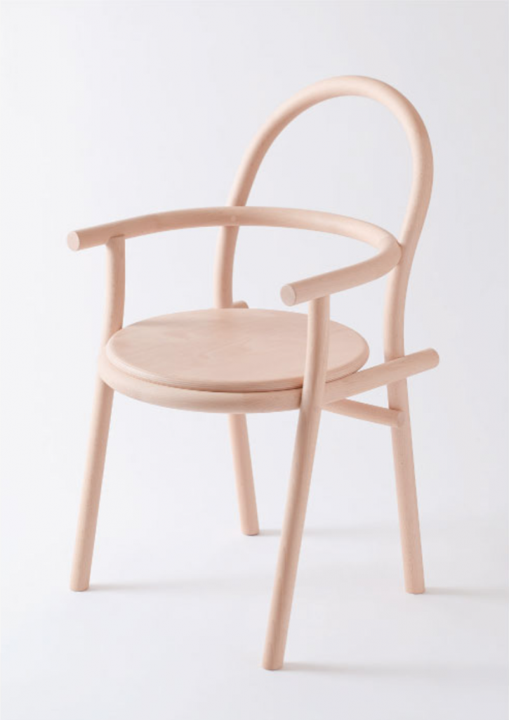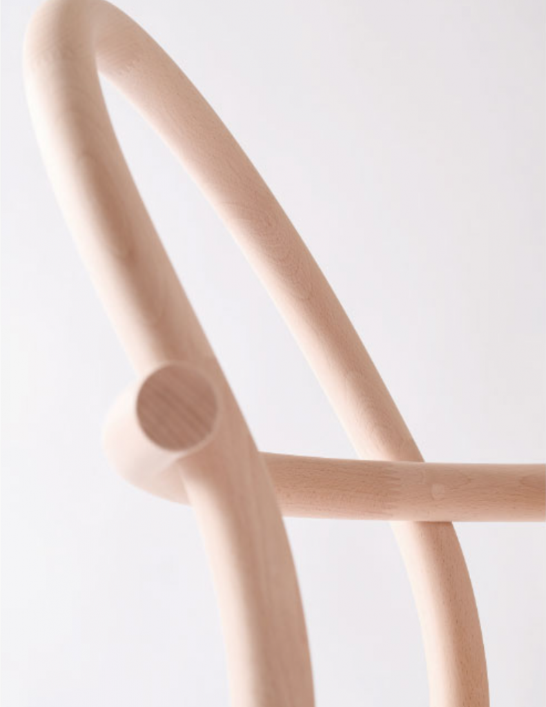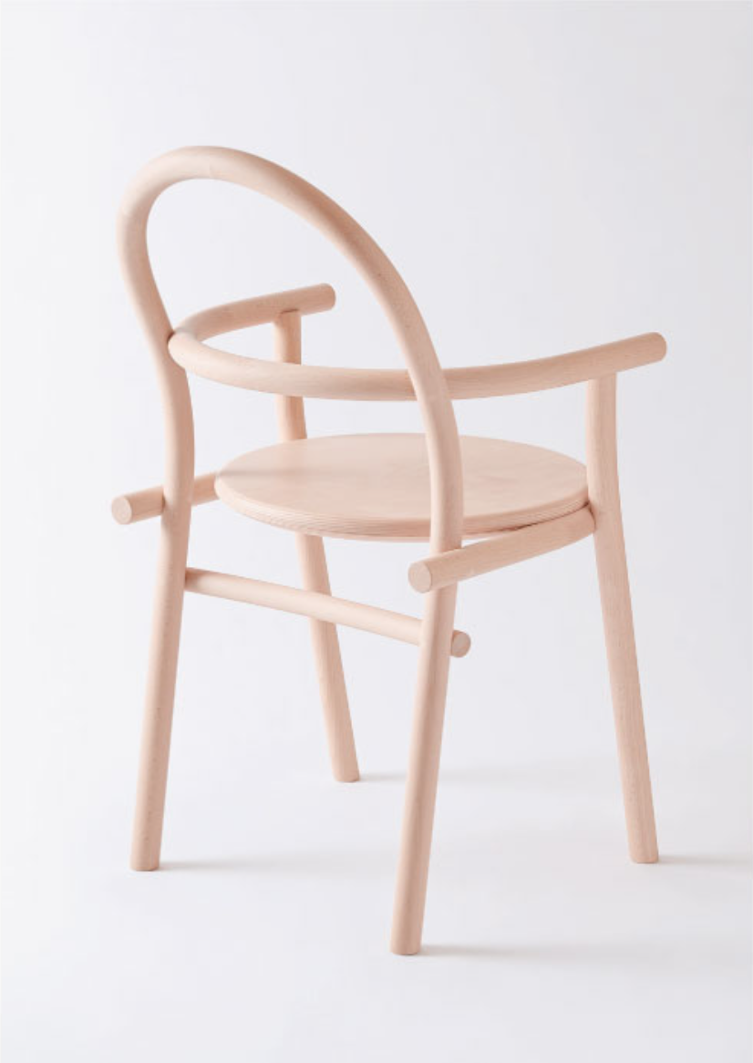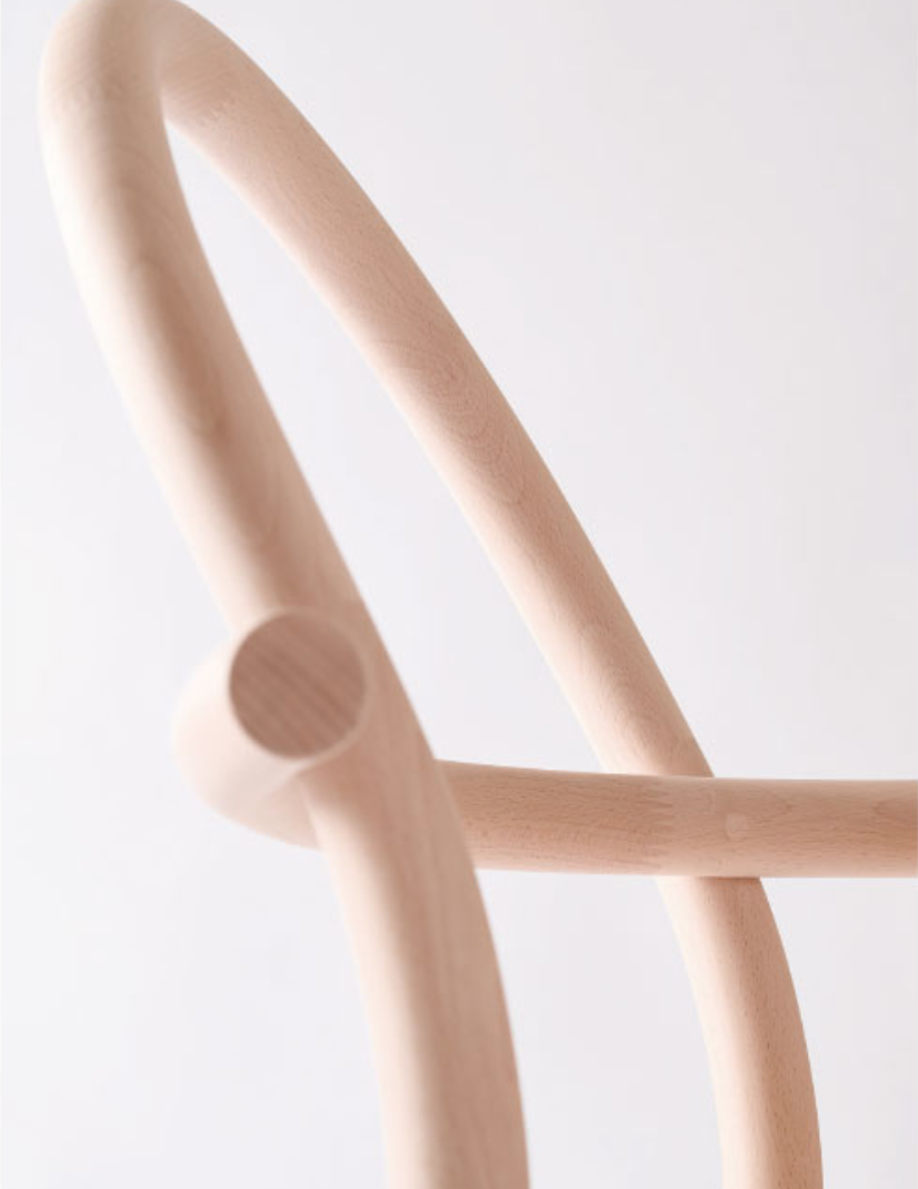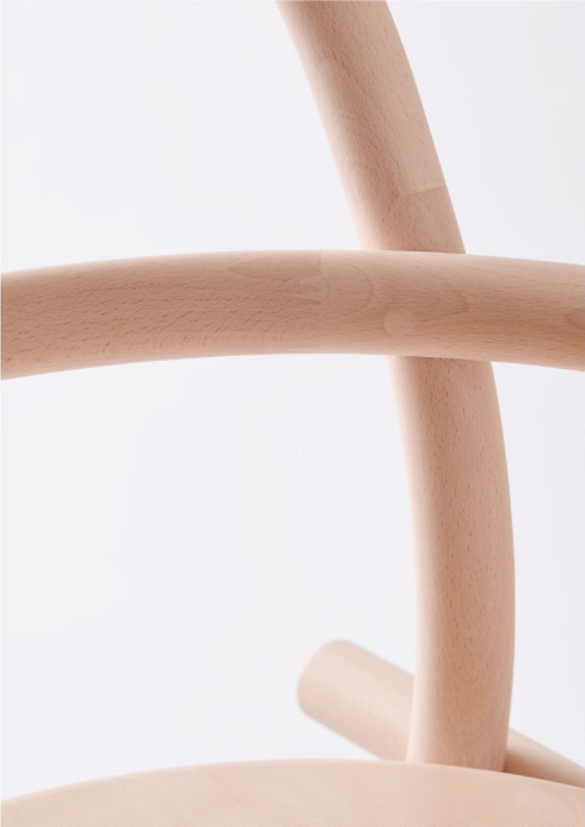 HIHI はシンメトリー(左右対称)のアームチェア、DADAはアシンメトリー(左右非対称)のシングルアームチェアです。部材の「重なり」と「ずれ」に着目し、相似と相違に焦点を当てて設計されています。材料は飛騨地域のブナ材。植林や伐採をおこなっている飛騨の森や製材所を巡り歩いて出会った木々です。もしこの椅子を曲木でつくるなら2m以上の木材が必要になりますが、小径木が多いという飛騨の木の特性を活かして、HIHI DADAはあえて短い部材をつなぎ合わせて構成しました。いくつもの部材を用いることで、ひとつの椅子の中に多様な色や表情が現れています。骨格となる丸棒は直径34mm。連結部は人が両手の指を組んだような櫛型のフィンガージョイントで接合されています。また、角柱の木を円柱状に削ることで浮かび上がってきた輪っか状の木目も、この椅子らしさのひとつです。部材は内と外に交差し合いながらゆるやかな曲線を描き、先端では円の断面が象徴的に顔を出しています。丸棒と丸棒のジョイント部分は、片方を直径の1/3の深さまで削って丸溝をつくり、もう一方の丸棒をその溝に隙間なくぴたりと付けました。飛騨の職人による「さりげなく、すごい」の集積でできた、まさにオートクチュールのような椅子です。がっちりした接合ではなく、ふんわりした接合。部材がただ接しているだけの、ある意味で未完全な状態には、ナイーブなやわらかさがあります。もちろん強度も兼ね備えており、製品は10年保証です。