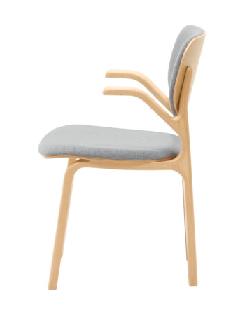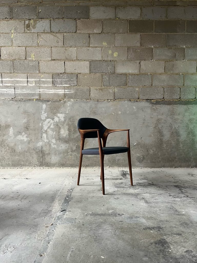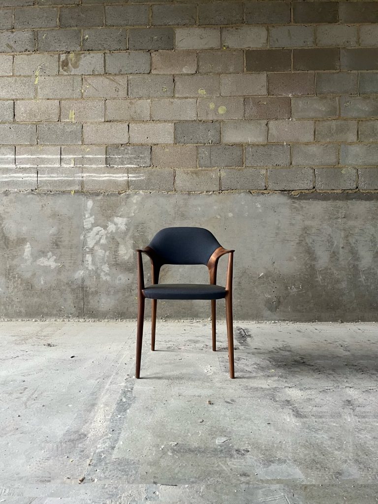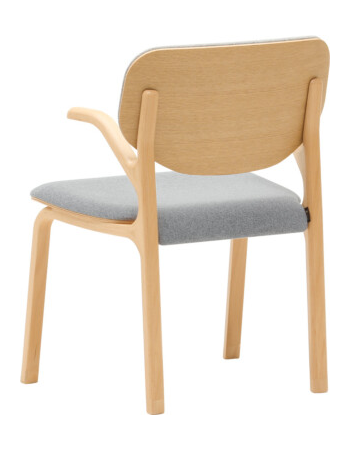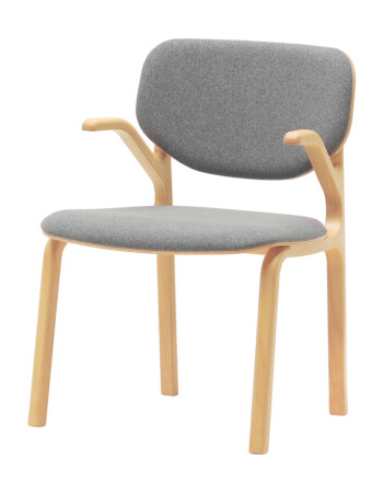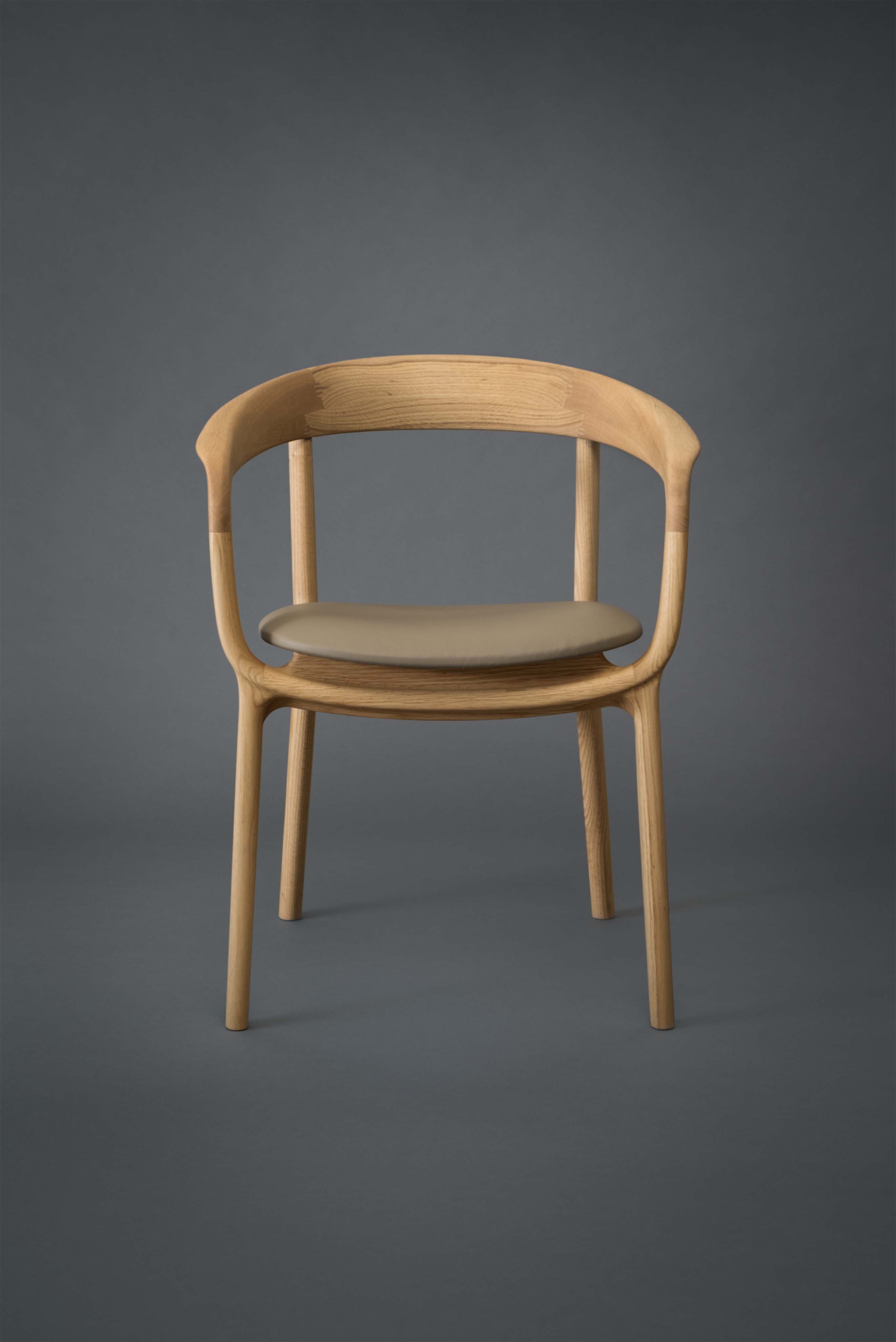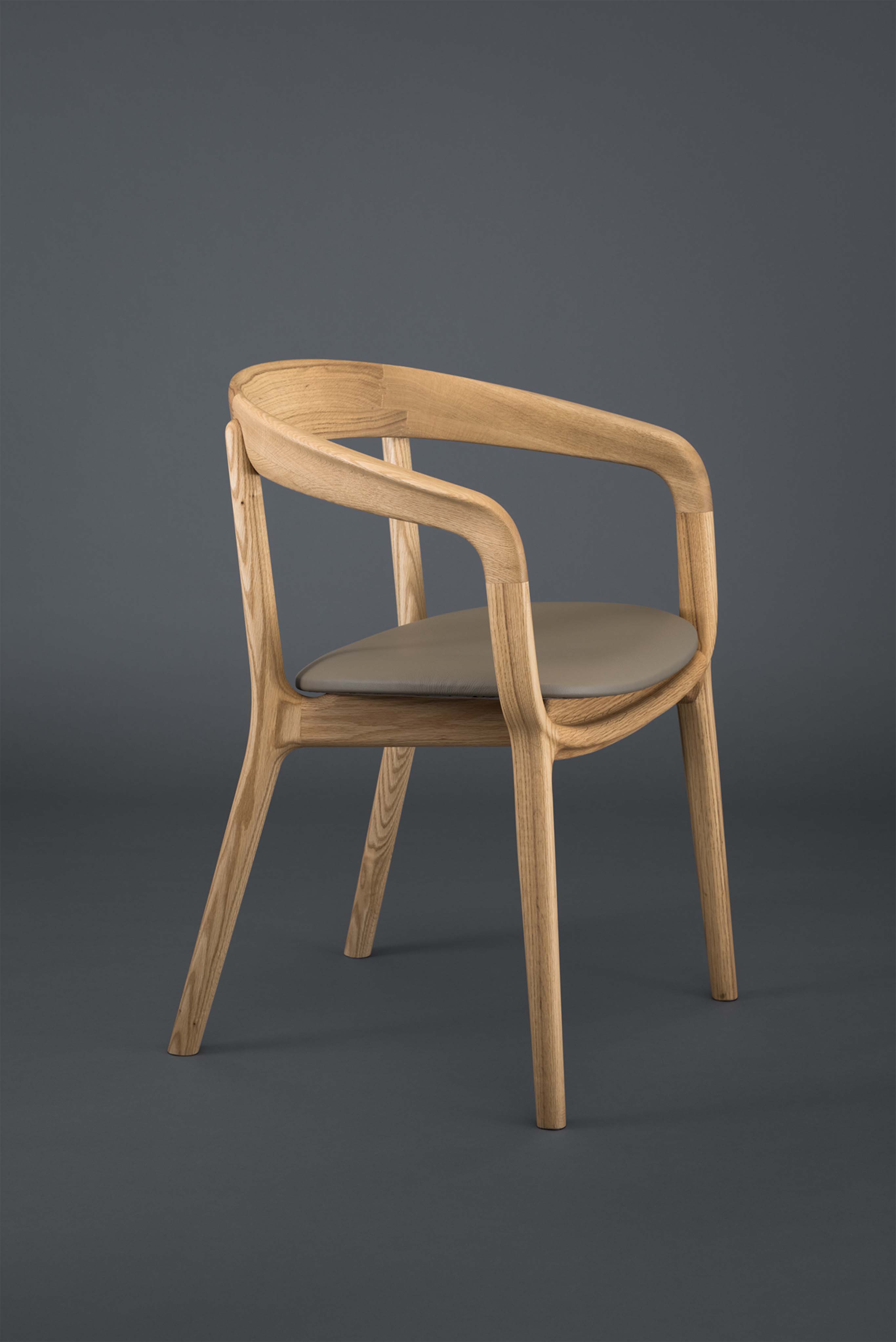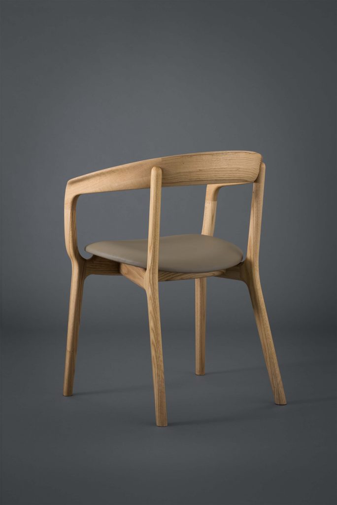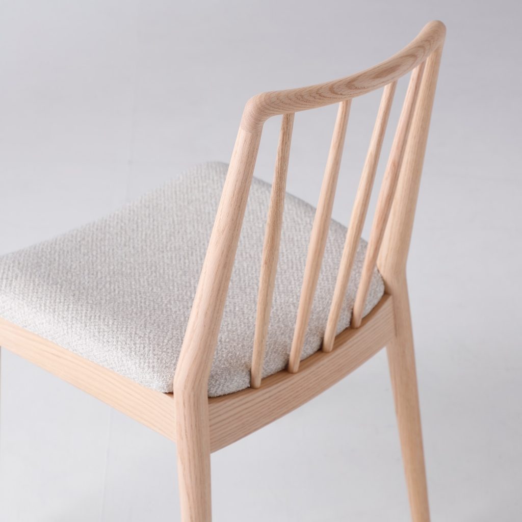 HUKLAのダイニングシリーズの中でも最上位モデルとなるダイニングチェアです。ブランドを象徴するような強い意匠の特徴を持ちながらも、日々の生活の中では空間に調和をもたらすようなデザインのバランスに注力しました。背中を支える笠木がアーム部分、座板を支える貫のパーツへと穏やかにつながり、人の体を取り囲むように一周の輪で繋がる意匠がこの椅子の特徴となっています。これは製品の明快な個性を示すとともに、使用者の体を優しく支えるような穏やかな印象を椅子全体に与えています。